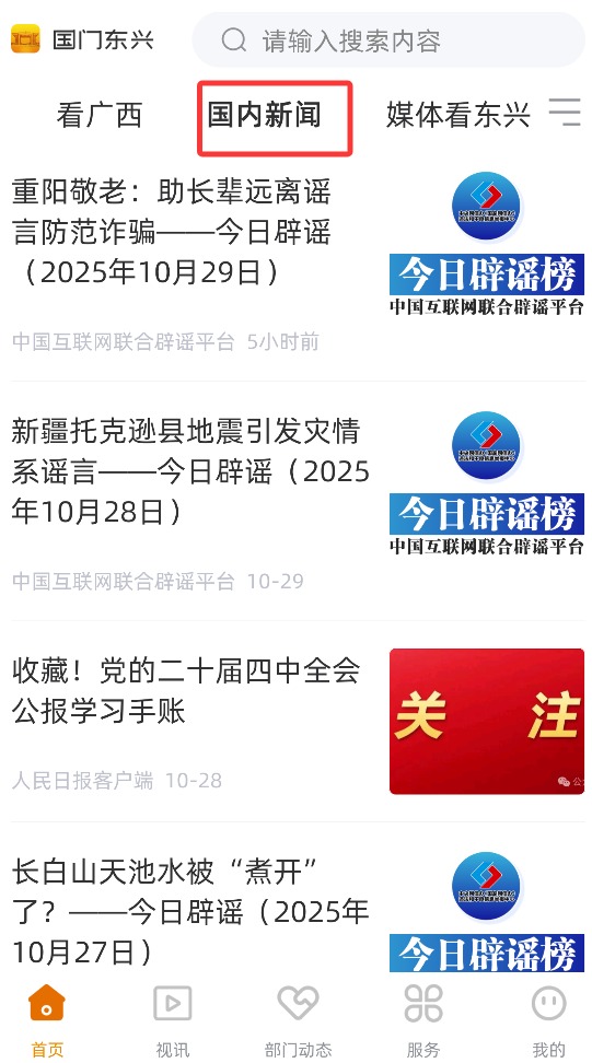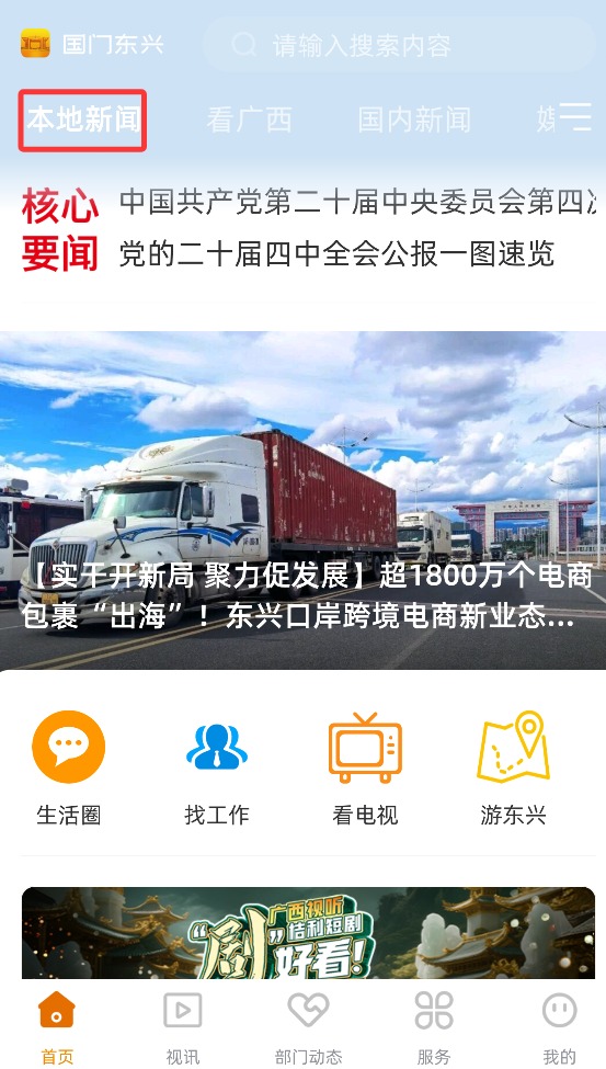1、打开国门东兴客户端后,您可在本地新闻板块浏览本市最新政务动态、社会事件及民生资讯。