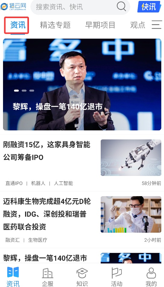 1、打开猎云网平台后,您可通过搜索资讯快讯功能查找特定企业动态、行业趋势或创投领域相关信息。