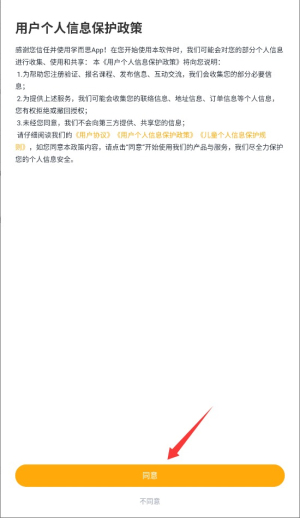 1、首次启动应用时,系统会显示用户协议和隐私政策,阅读后点击同意按钮进入主界面。