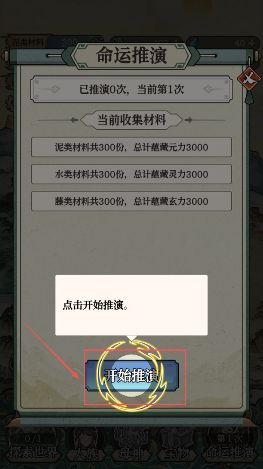 4、点击开始按钮开启冒险旅程收集材料,根据任务要求和资源分布,掌握探索技巧和时机把握,优化获取效率和成功率,获得发展优势。