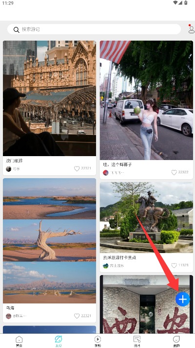 3、进入发现页面可浏览其他用户分享的旅行笔记,点击右下角发布按钮开始创作。