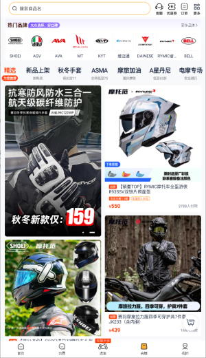 2、进入主界面后选择"配件商城"栏目,浏览各类摩托车配件与装备。