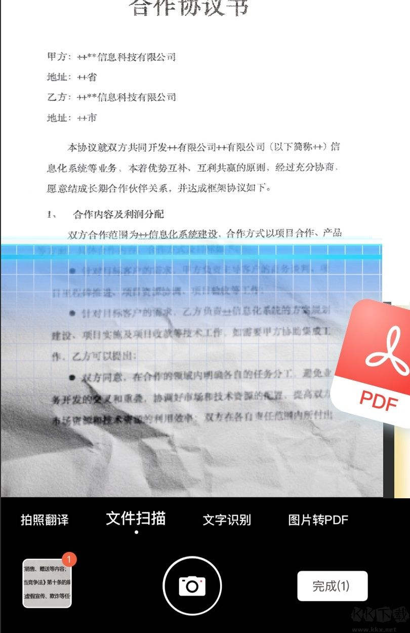 支持对单页或多页文件、书籍、笔记等内容进行超清扫描,快速生成高质量PDF文档;扫描后可调节对比度、应用滤镜等优化图像效果;
