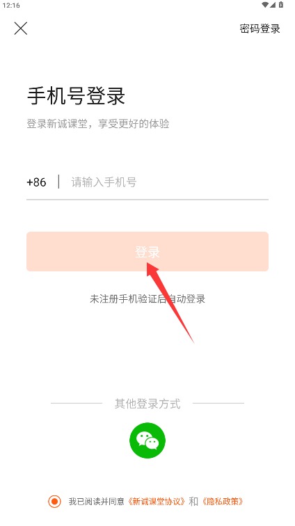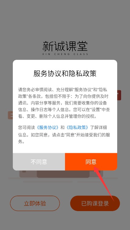 1、打开新诚课堂应用后仔细阅读用户协议和隐私政策,确认后点击同意按钮进入系统。