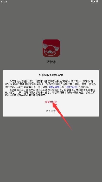 1、打开猪管家客户端后仔细阅读隐私政策与用户协议,确认后点击同意并接受进入。