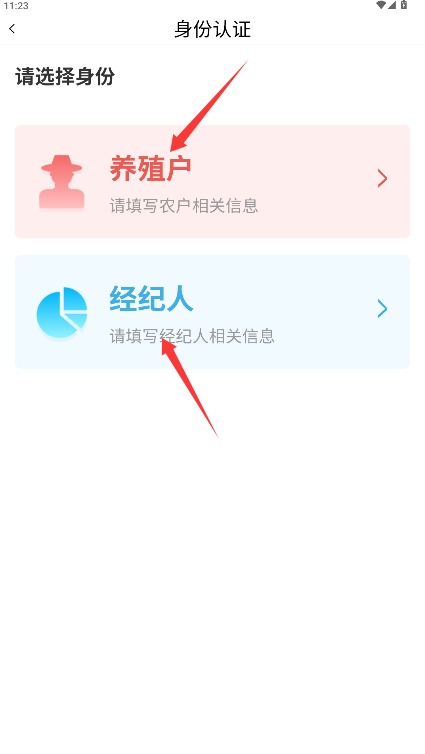 3、根据实际从业身份选择养殖户或经纪人认证类型选项,系统将匹配对应功能权限设置。