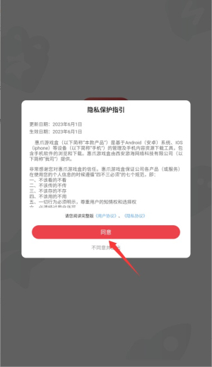 1、首次启动应用时,系统会显示用户协议和隐私政策,阅读后点击同意按钮进入主界面。