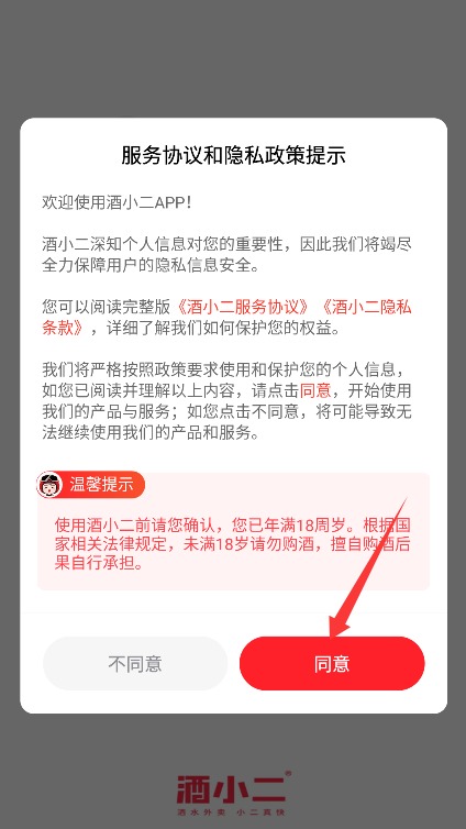 1、打开应用后仔细阅读服务协议和隐私政策,确认后点击同意按钮进入系统。