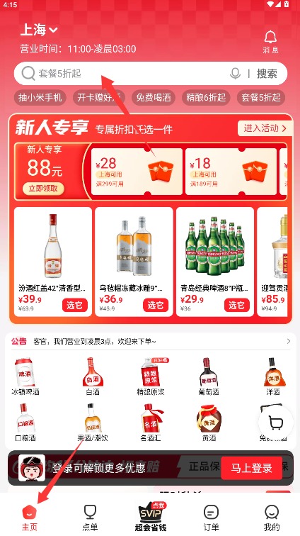 4、进入首页可浏览商场推荐商品,通过搜索查找目标酒水饮料并下单购买。