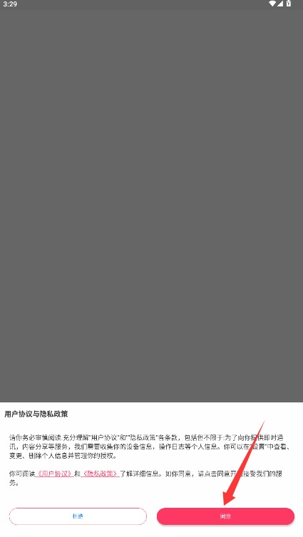 1、打开应用后仔细阅读用户协议和隐私政策,确认后点击同意按钮进入系统。