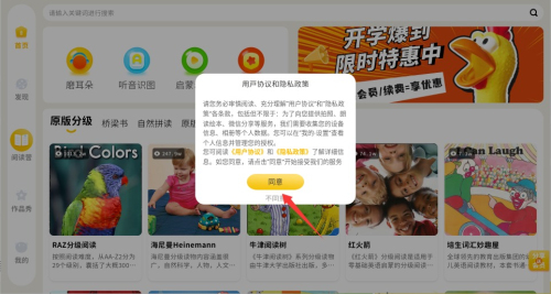 1、首次启动应用时,系统会显示用户协议和隐私政策,阅读后点击同意按钮进入主界面。