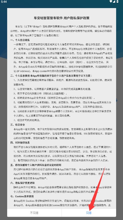 1、打开车安哒应用后仔细阅读隐私保护政策内容,确认后点击同意按钮进入系统主界面。