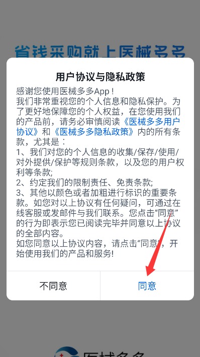 1、打开应用后仔细阅读服务协议和隐私政策,确认后点击同意按钮进入应用。