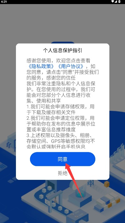 1、打开应用后仔细阅读服务协议和隐私政策,确认后点击同意按钮进入应用。
