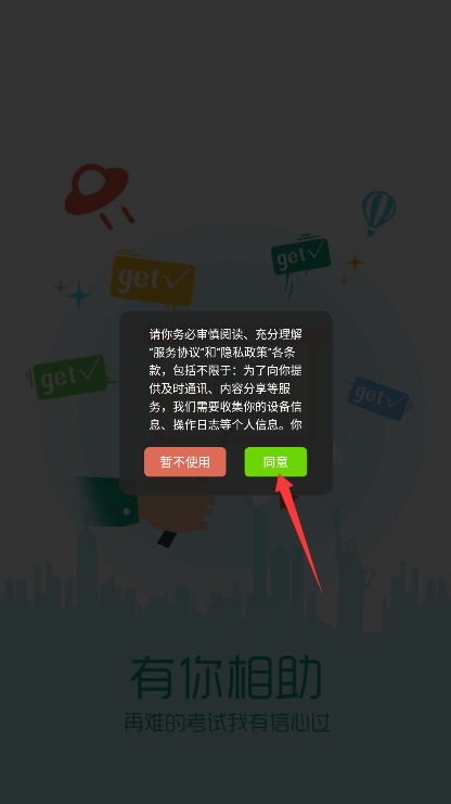 1、打开应用后仔细阅读服务协议和隐私政策,确认后点击同意按钮进入应用。