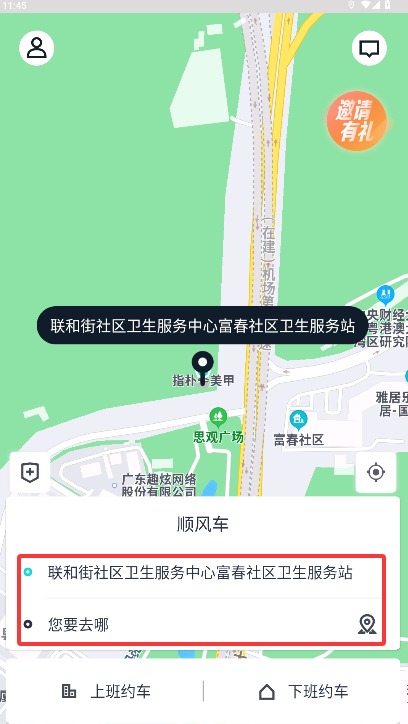 3、进入应用主界面根据通勤需求选择上班约车或下班约车服务模式类型。