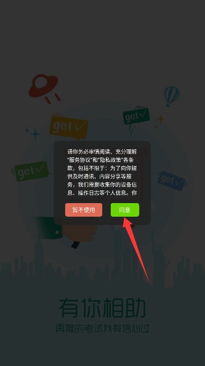 1、打开应用后仔细阅读服务协议和隐私政策,确认后点击同意按钮进入应用。