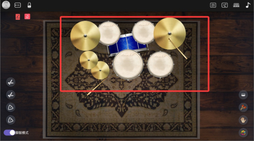 2、进入程序首页即可看到虚拟爵士鼓界面,通过触控不同区域可演奏相应打击乐音效。