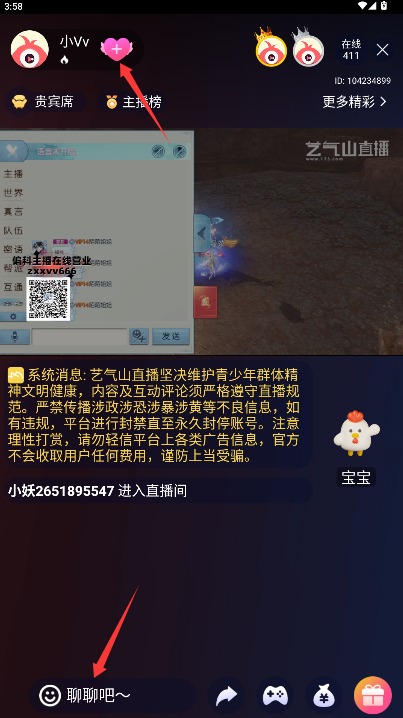 4、观看直播时点击左上角关注按钮可收藏主播,左下角输入框可发送互动弹幕。