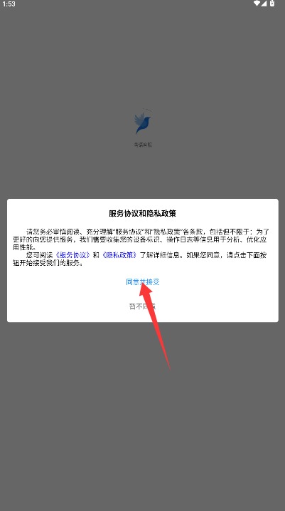 1、打开应用后仔细阅读服务协议和隐私政策,确认后点击同意并接受按钮进入。