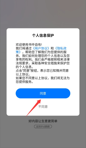 1、首次启动应用时,系统会显示用户协议和隐私政策,阅读后点击同意按钮进入主界面。