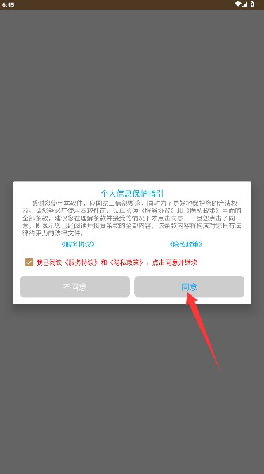 1、打开应用后仔细阅读服务协议和隐私政策,确认后点击同意按钮进入应用。