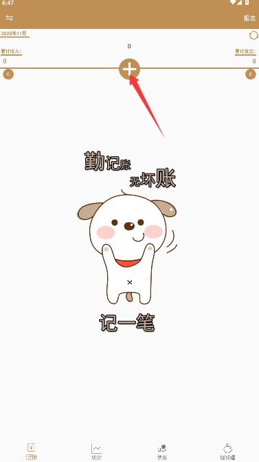 3、进入记账功能页面后,点击上方中间加号按钮开始创建新的收支记录条目。