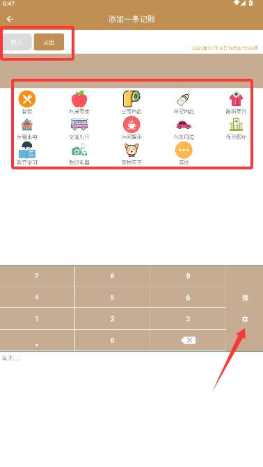 4、选择收入或支出分类,填写具体金额并添加备注说明,确认后保存记账信息。