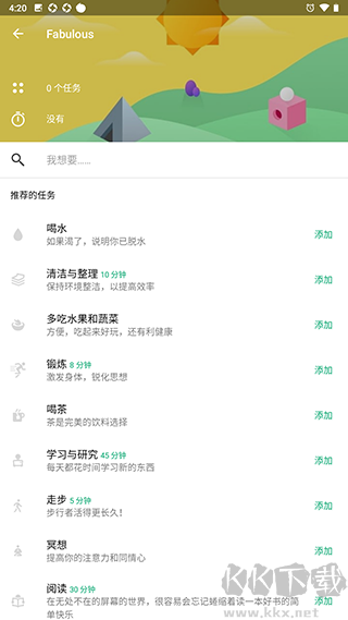 3、进入后可以设置自己要完成的事情,比如喝水、锻炼、阅读等,点击添加即可加入到打卡任务。