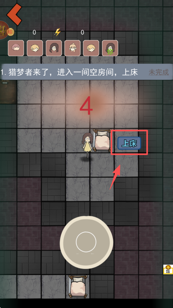 4、最后,在房间内点击“上床”按钮,让角色上床休息,完成任务目标。