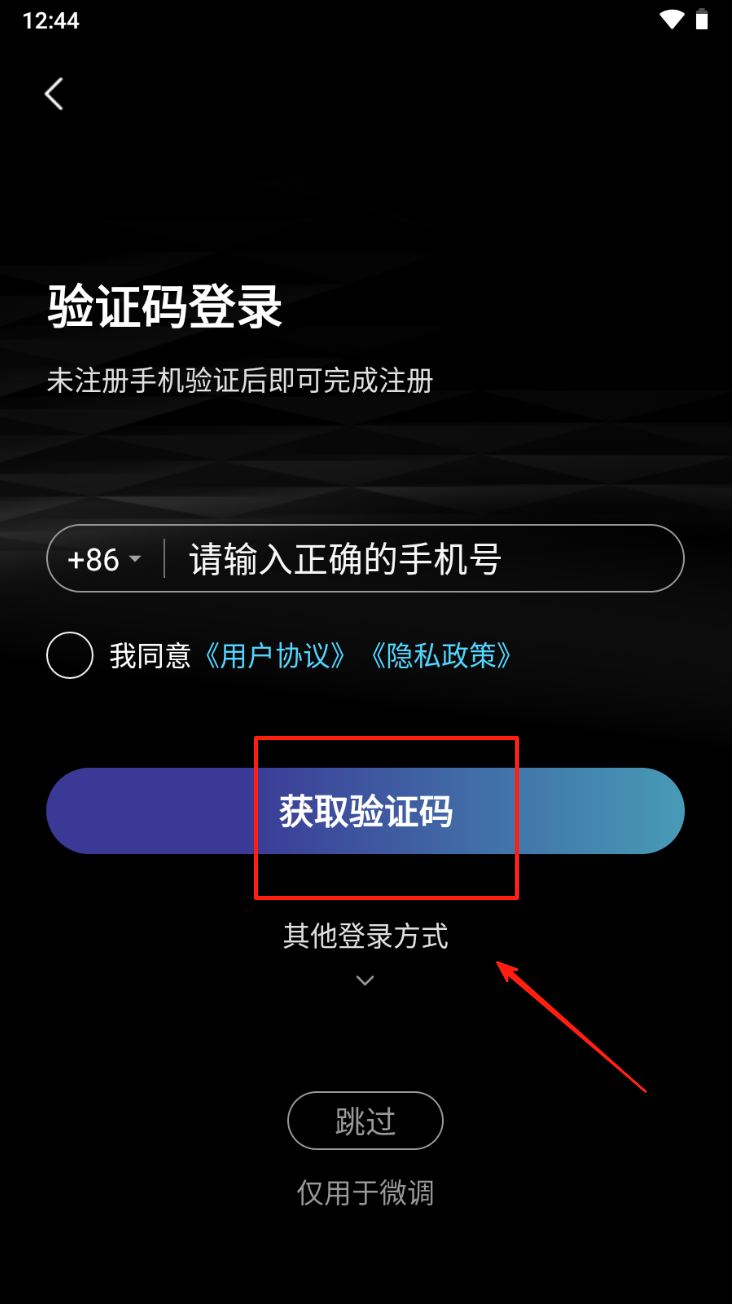 3、输入手机号并同意协议,点击“获取验证码”进行验证。