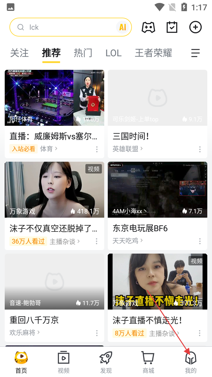 1、打开虎牙直播APP,进入首页后,若要进行个人相关操作,点击右下角【我的】按钮。