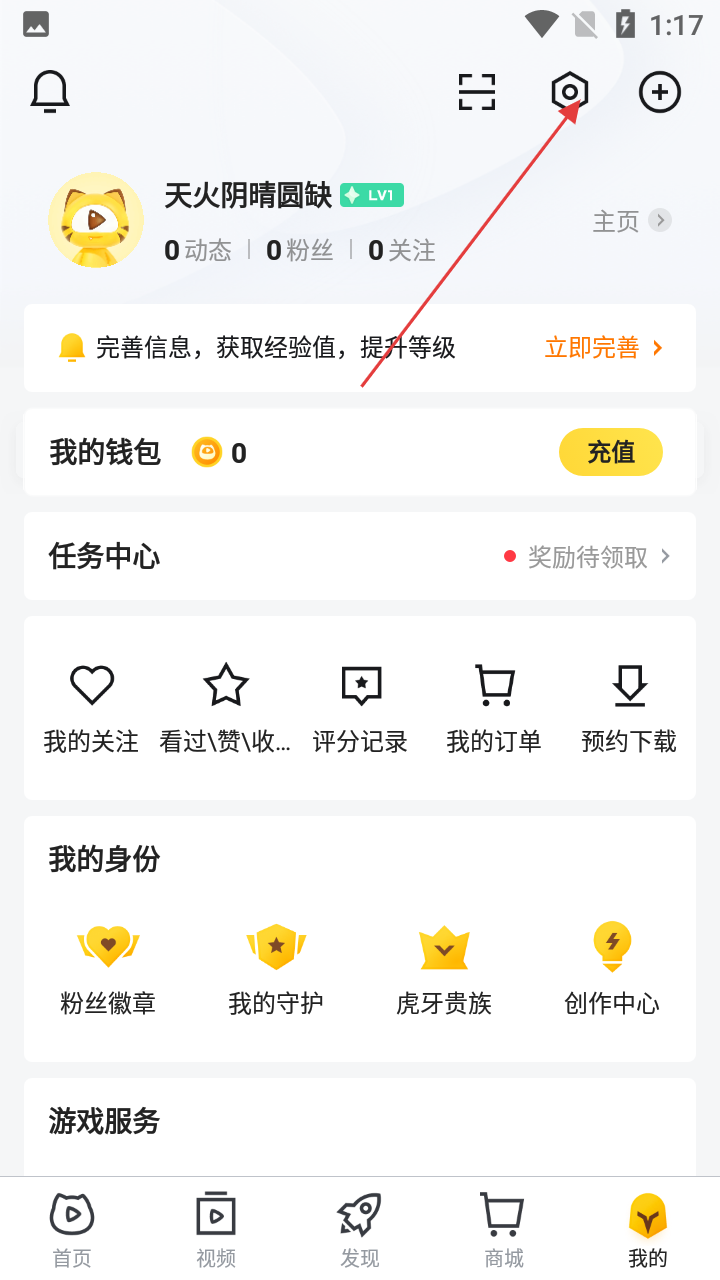 2、进入【我的】页面后,点击右上角设置图标,进入设置界面准备进行设置。