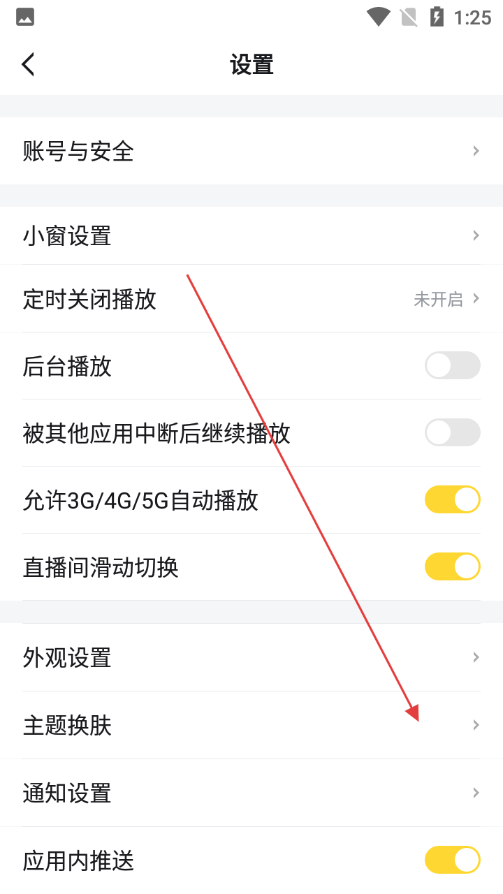 3、在设置页面中,找到【主题换肤】选项并点击,进入装扮中心界面。