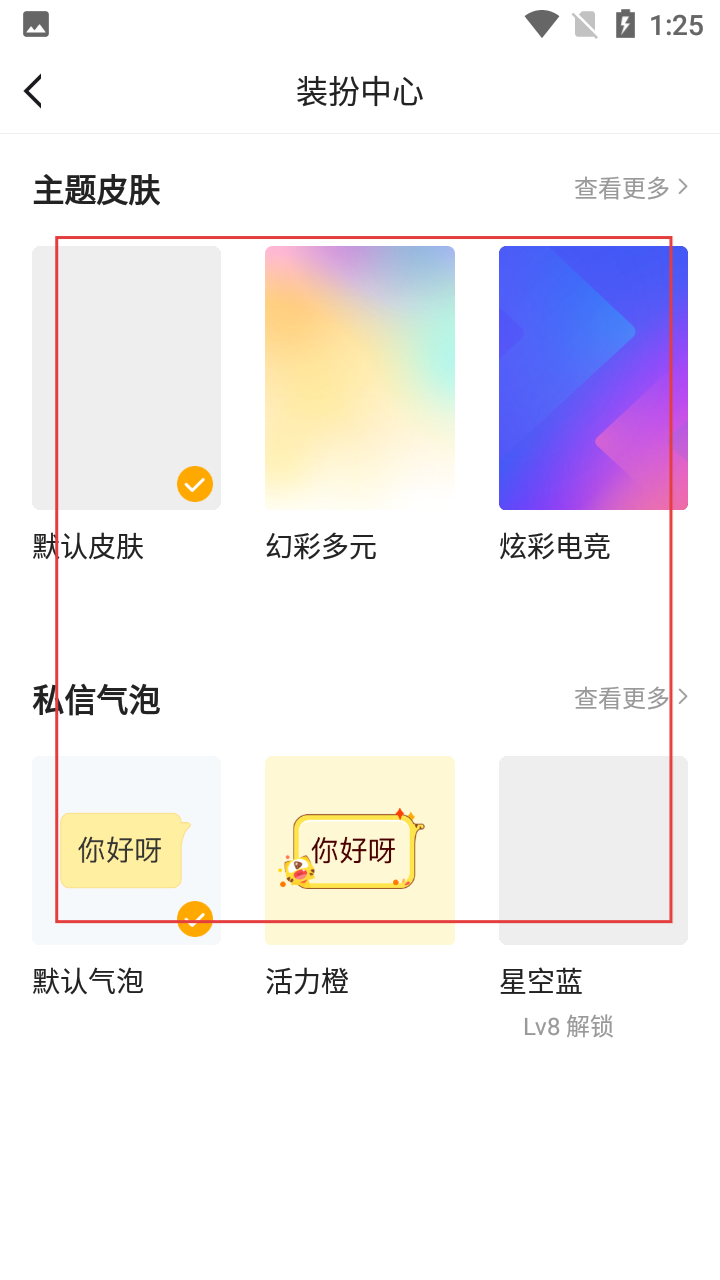 4、进入装扮中心后,可选择喜欢的主题皮肤和私信气泡,打造个性化界面。