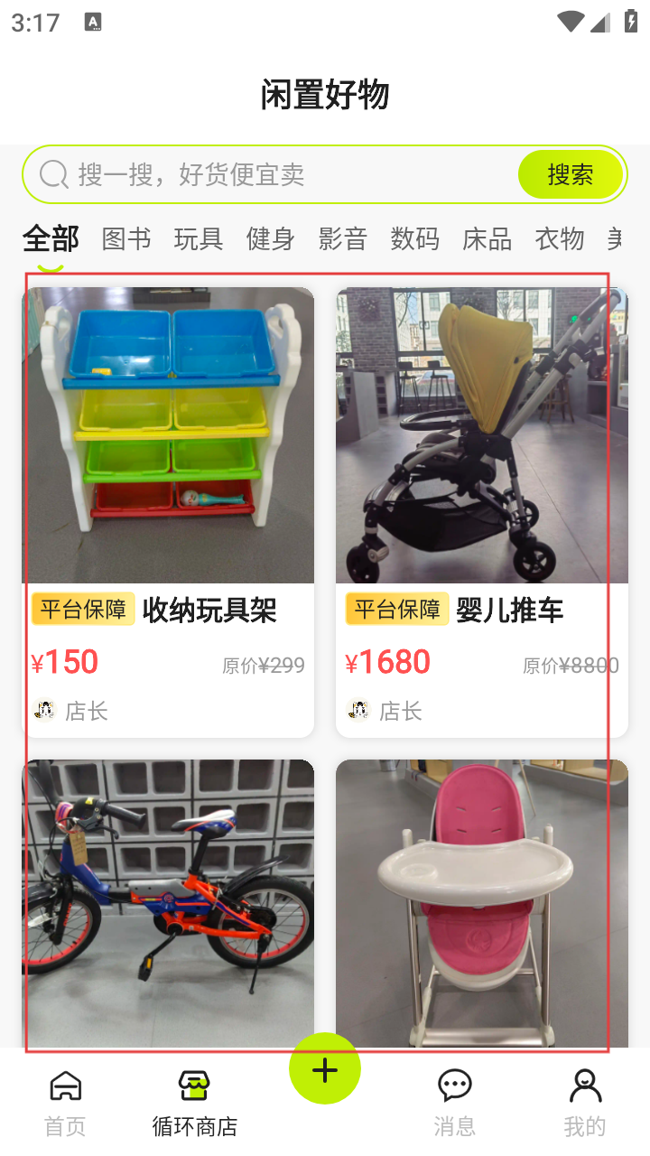 2、在【循环商店】页面,挑选心仪闲置好物,如收纳玩具架、婴儿推车等,查看商品详情。