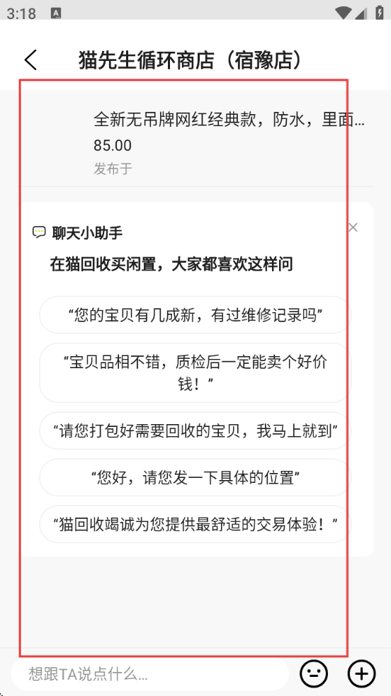 4、进入聊天界面,可借助【聊天小助手】推荐话术,如询问几成新、维修记录,高效沟通。
