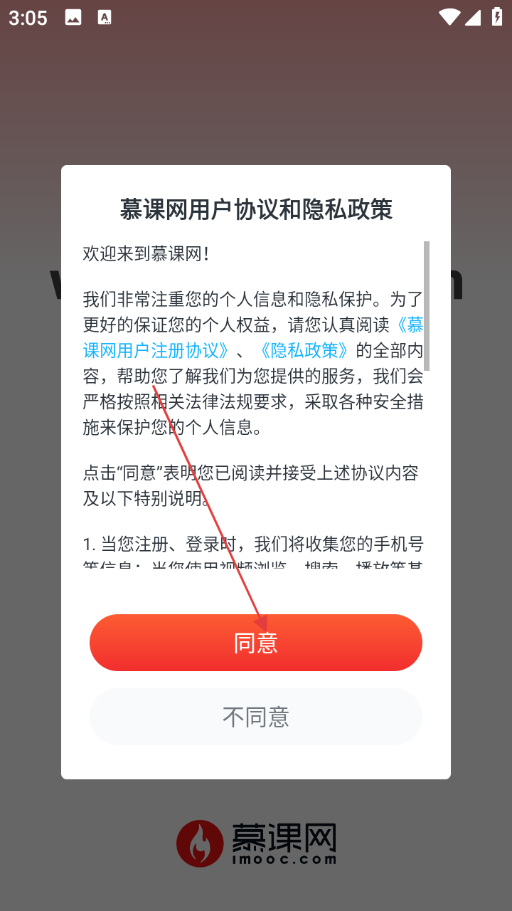 1、打开慕课网APP,在用户协议和隐私政策页面,点击【同意】。