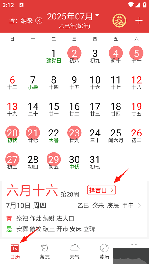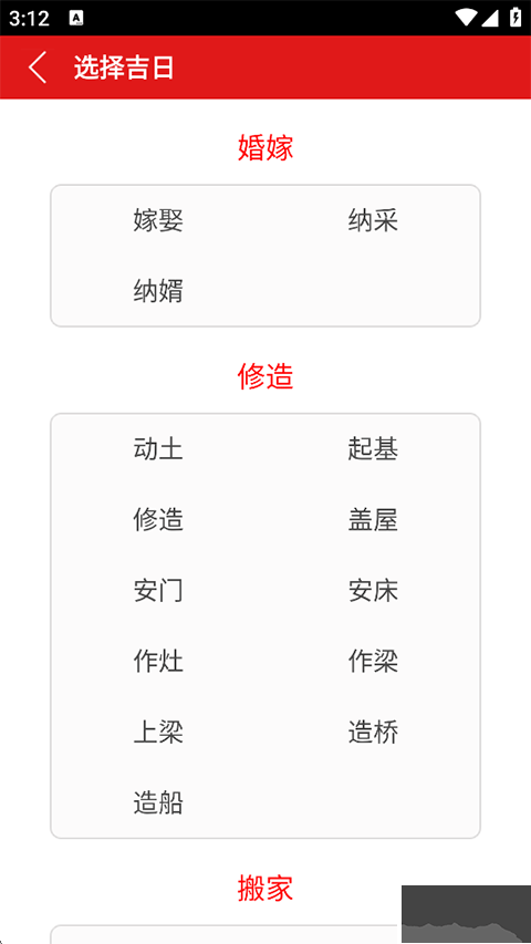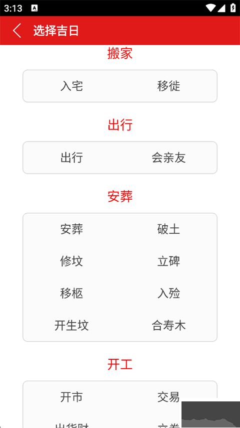 3、往下滑动还有搬家、出行、安葬以及开工等多个分类;