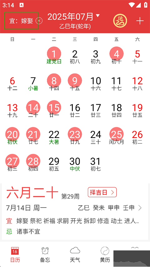 4、页面中标红的日期即是“宜:嫁娶”的黄道吉日;