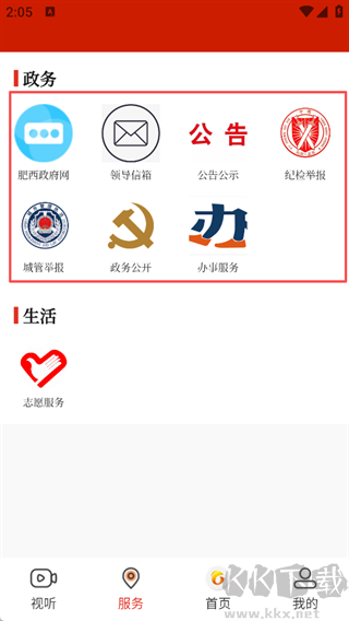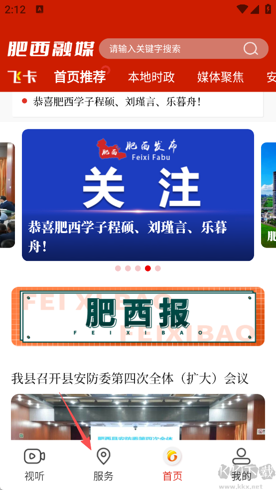 1、启动肥西融媒应用程序,进入下方【服务】栏目。
