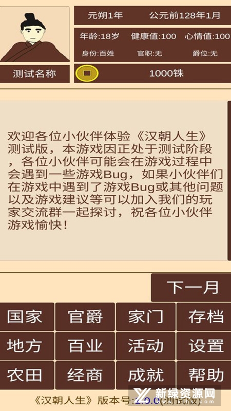 汉朝人生修改版免广告是一款全新好玩的文字冒险类游戏,此版本已破解免广告获得奖励,游戏中玩家将回到古代时期,选择自己的人生路线,种田或者富商任意选择,感兴趣的小伙伴赶快下载体验吧!