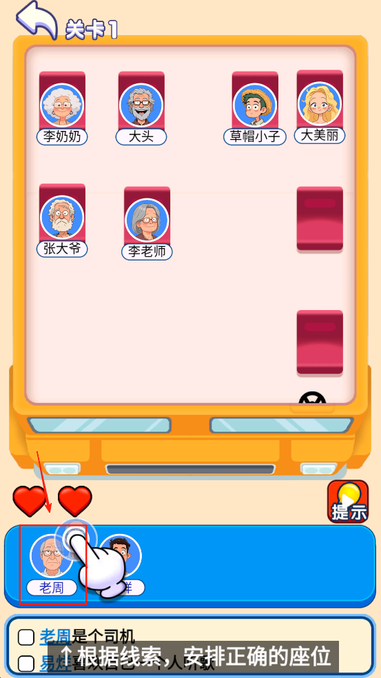4、根据线索提示,将角色拖动到正确的座位上完成游戏。