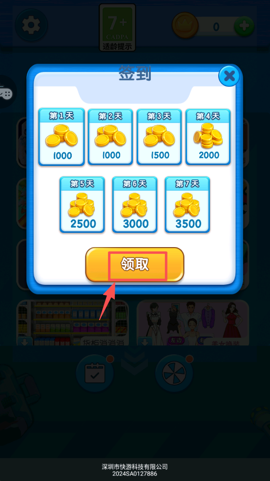 2、点击“签到”领取每日金币奖励,积累资源,为后续游戏做好准备。