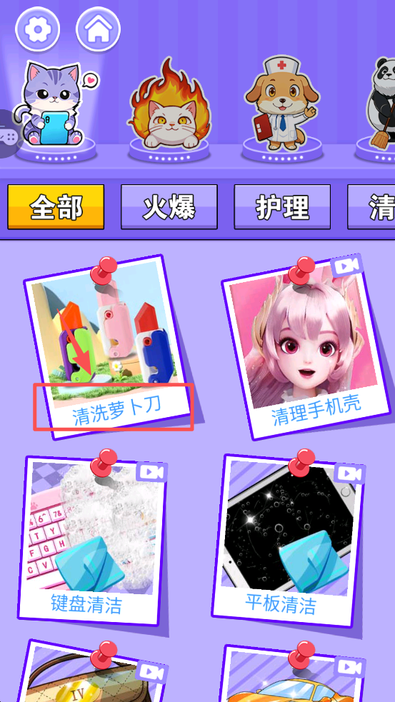 1、选择一个游戏模式进入,例如点击“清洗脏东西”开始游戏,体验游戏乐趣。