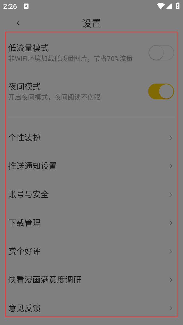 3、在设置页面,能看到【低流量模式】【夜间模式】等功能,点击【夜间模式】开关可开启该模式。