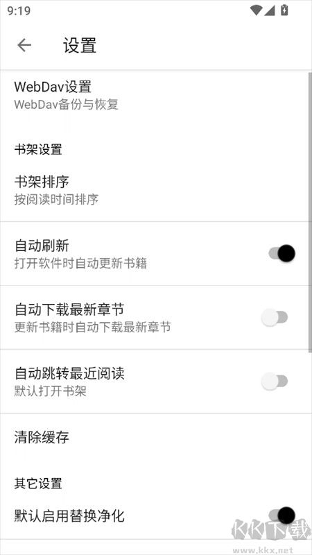 4、在设置界面下,我们可以进行webdav设置、书架排序、自动刷新等一系列操作。