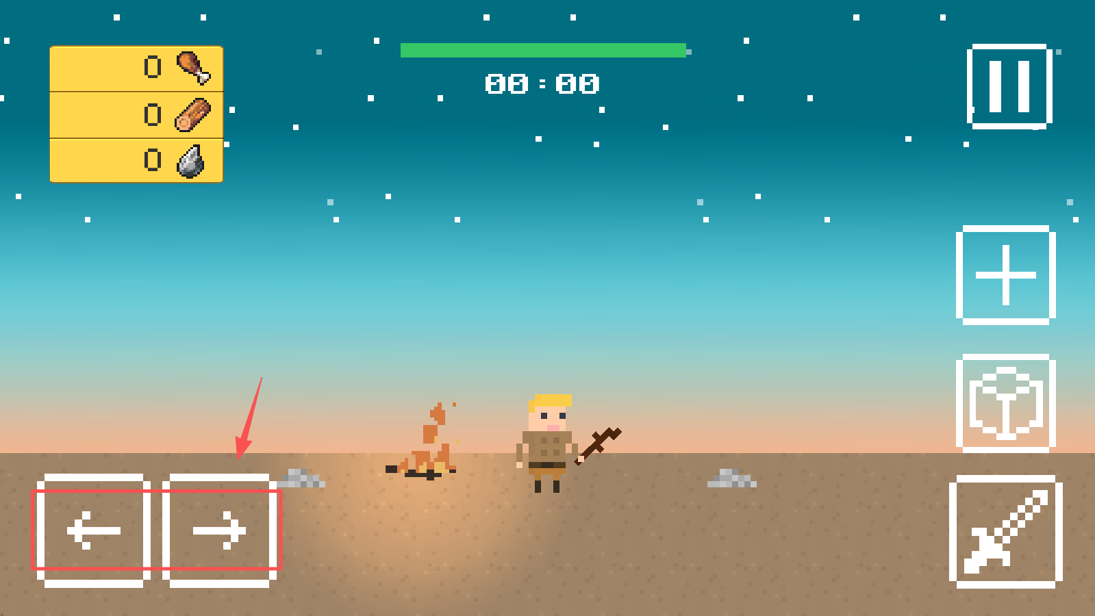 4、使用屏幕上的虚拟按钮控制角色移动和攻击,收集资源,生存下去。