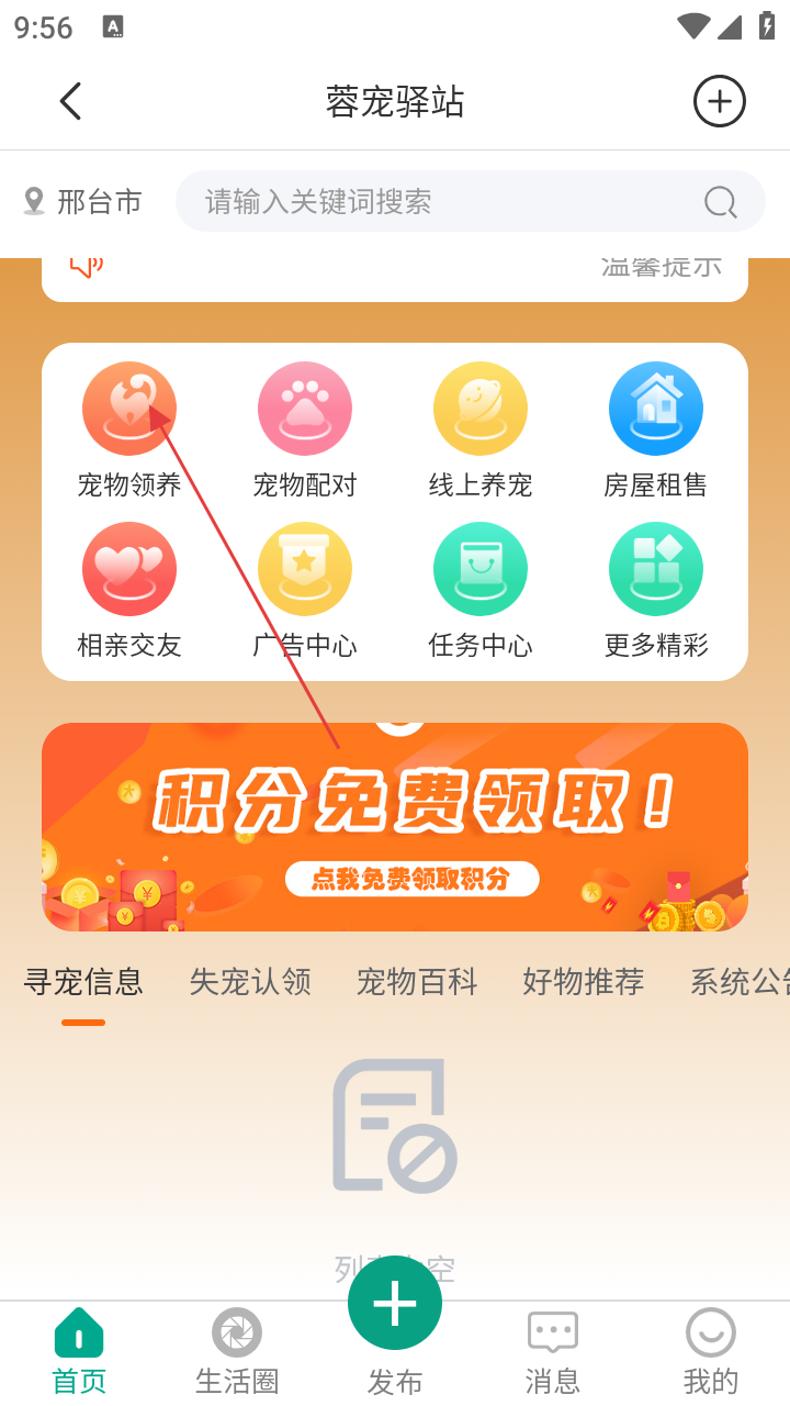 1、进入【蓉宠驿站】首页,能看到【宠物领养】【宠物配对】等功能入口,点击【宠物领养】可进入领养页面。