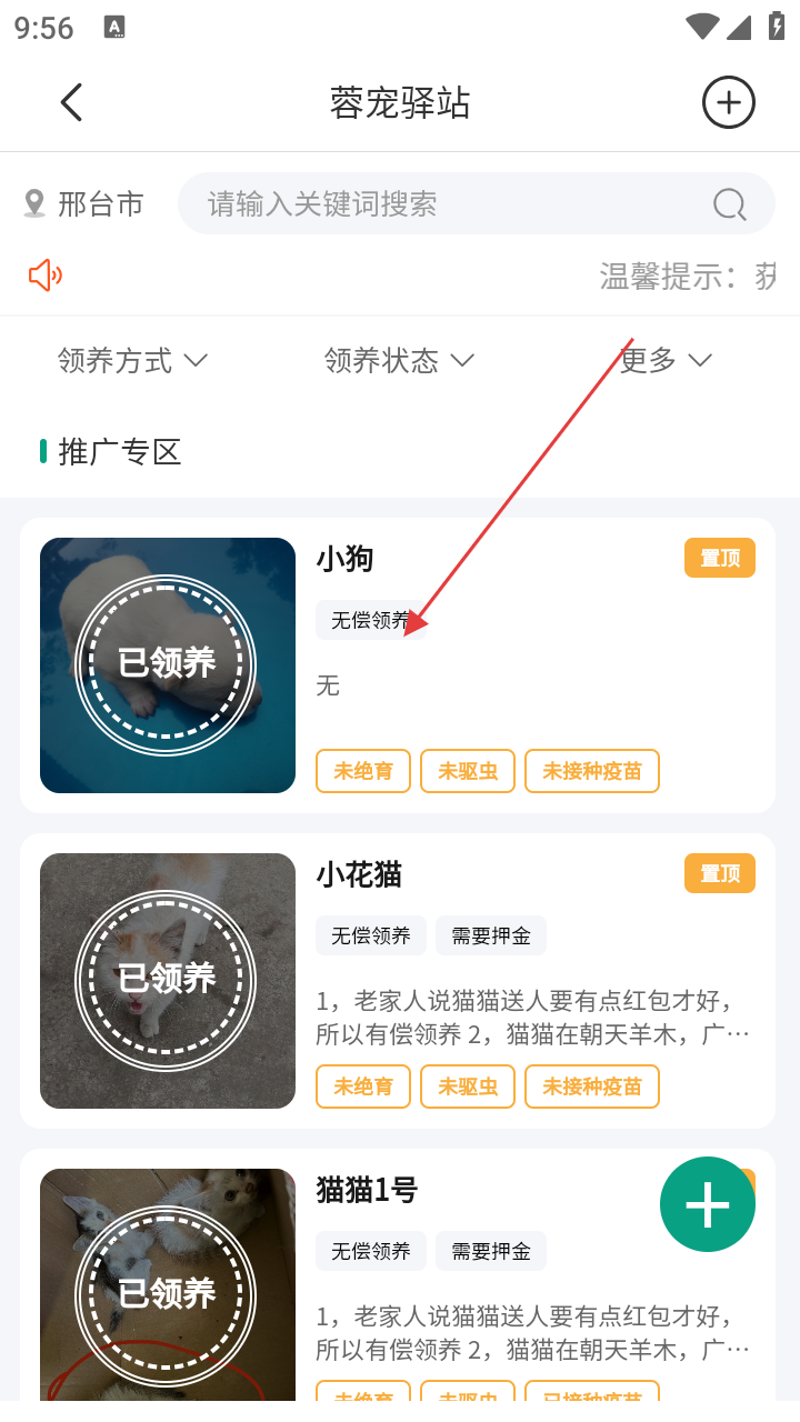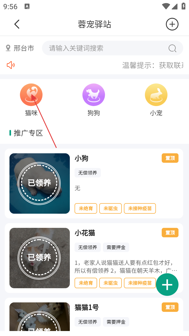 2、在领养页面,可选择宠物类型,如【猫咪】【狗狗】【小宠】,查看对应宠物的领养信息。